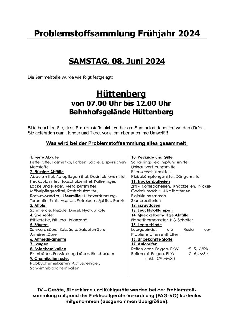 Aufgrund von Vorgaben des Entsorgers gibt es nur mehr eine Sammelstelle in der Gemeinde, welche sich am ehemaligen Bahnhofsgelände in Hüttenberg (Bahnhofstraße 32) befindet.