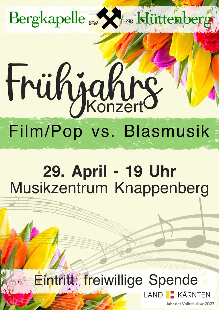 Die Bergkapelle Hüttenberg lädt am 29.04.2023 zum Frühjahrskonzert ins Musikzentrum Knappenberg.